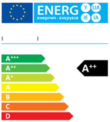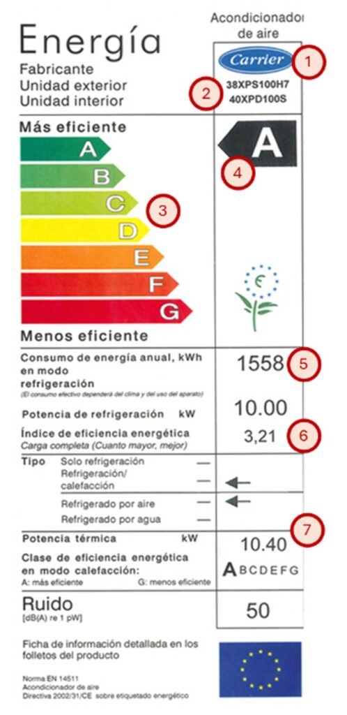 La etiqueta clasifica la eficiencia energética del producto mediante una escala de la A a la G, siendo «A» la más eficiente y «G» la menos eficiente.